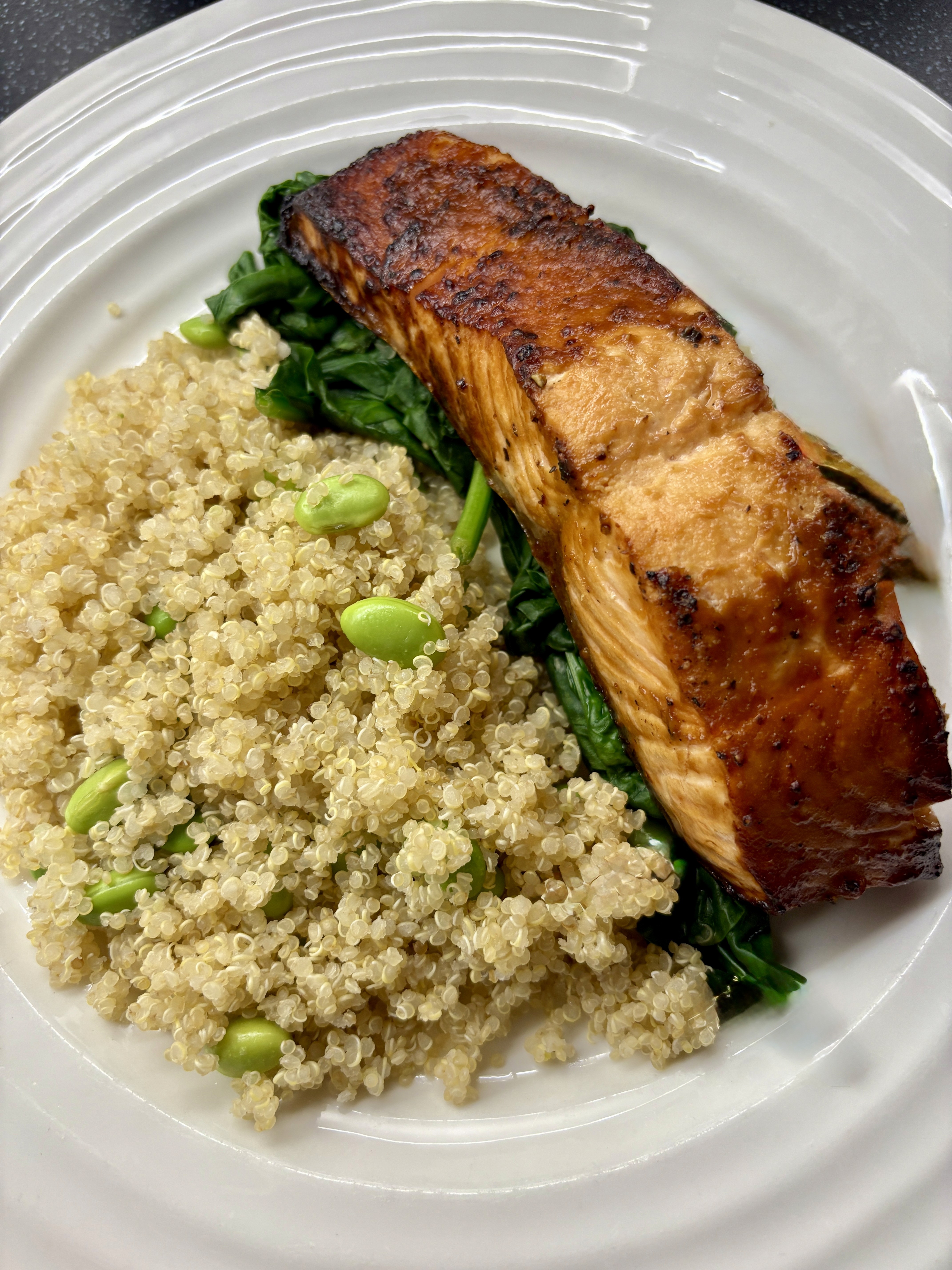 Divide the quinoa between 2 dishes and top with the miso-glazed salmon.